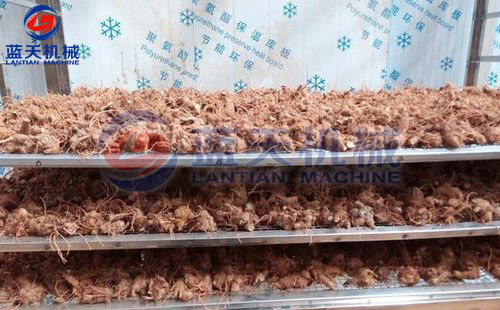 2:先將采收的文山三七挑選裝盤,使用不銹鋼托盤、合理均勻?qū)⑷邤[放至托盤架中,每層間隔約為10厘米至15厘米,不宜鋪放太多,擺放以通風(fēng)透氣為佳,這樣每一層三七都能均勻受熱、干燥脫水。
