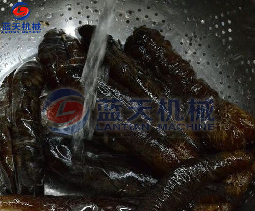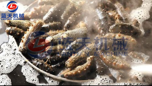 第三步:蒸煮海參:當(dāng)水溫在90度時,將清洗好的海參放入鍋里蒸煮,用工具來回攪拌,防止水溫不均,這時可見到海參迅速縮小,海參刺明顯突出。約半小時后,撈出海參,視情況拌入粗鹽。