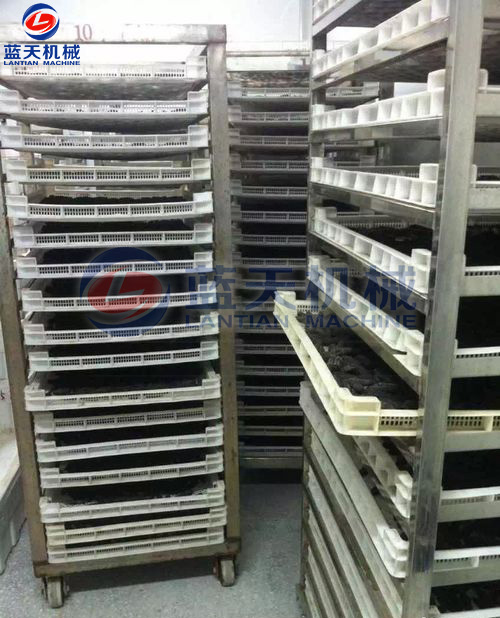 第四步:海參烘干:將煮好的海參擺放在物料盤上,將擺好海參的物料盤放置入空氣能熱泵海參烘干機(jī)內(nèi),通過智能控制系統(tǒng)設(shè)置烘干溫度、濕度和時間參數(shù),開始干燥。