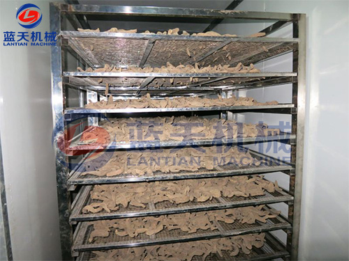 天麻蒸制后,先在烘干機或烘房內烘至半干。烘干初期,溫度保持在50~60℃,并保持適當通風。以后每小時提高0.5℃,逐步提高至65℃。烘干初期若溫度過高,天麻容易出現糠心;溫度過低,通風不好時天麻容易變質。若天氣晴好,也可日曬夜烘,降低烘干成本。