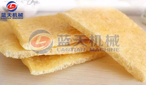 在油爆漲發前,豬皮需要在溫油中回軟,這是能否漲發的關鍵,油溫應該掌握在40-50度左右,溫度高了也會影響漲發的程度,是否回軟達標、視肉皮軟塌程度確定,這項操作標準在文字上無法準確清楚表述,只有在加工過程中熟能生巧,最終生產加工經驗是主要的?;剀浐蟮拇捅馄摫3只剀洜顟B不能回硬,將鍋中油溫升到80度后即可將肉皮放入油鍋中,邊翻動邊加溫,油溫達到120度時豬皮就可以漲發好了,在漲發時油溫應掌握好,不得過高,關鍵是保持不焦不老不黃的感官程度和完全漲發開的標準,完全漲發后的皮肚,從熱油鍋內撈出后應當控盡油脂并冷卻到常溫后方可包裝。不得未控盡油脂和降低溫度就進行包裝,否則既影響包裝又影響產品質量。