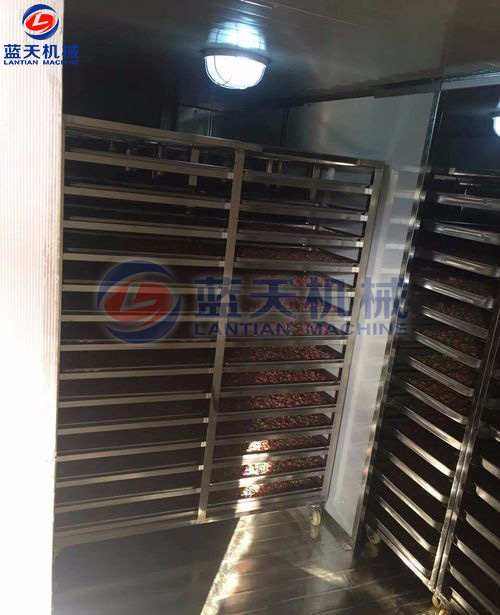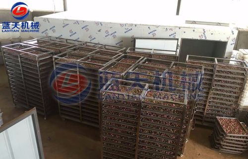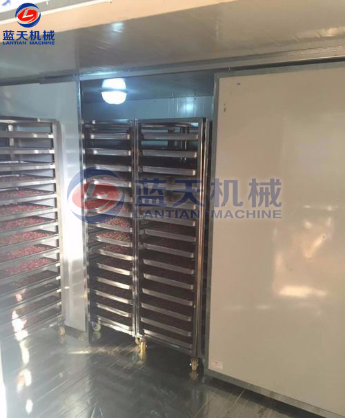 裝滿花蕾的物料車要輕輕推入烘干房,關閉烘干房室門升溫,嚴格控制室內溫度、依次順序溫度慢慢提升,采用循環風路,確保花蕾干濕均勻,色澤鮮艷。
