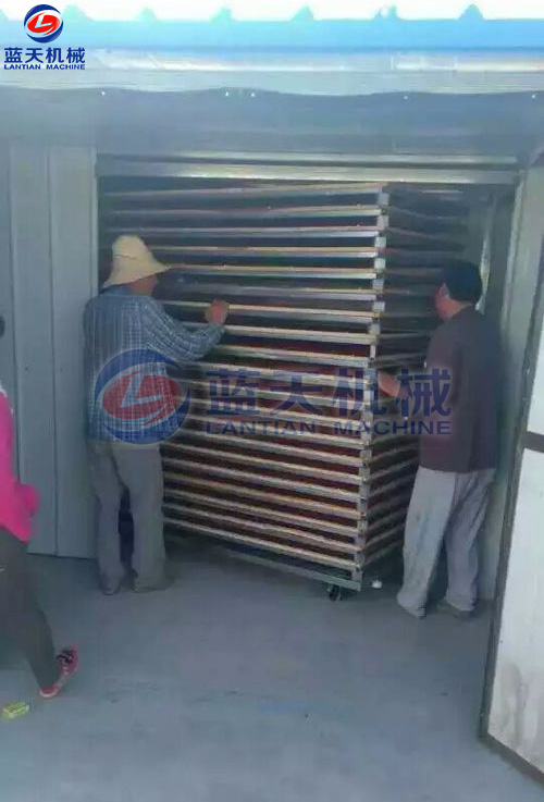 鮮果由于果內(nèi)的水分外滲,皮層聚集充分的非結(jié)合水分,這是因?yàn)楸砻娴乃魵鈮号c溫度氣壓基本相同,壓迫果實(shí)內(nèi)部水分很快移向表面以滿足表皮水分汽化的需要。果實(shí)內(nèi)失水率達(dá)到近50%時(shí),室內(nèi)溫度自然上升到50℃-55℃,循環(huán)風(fēng)速可有所下調(diào),果內(nèi)含水越少,脫水時(shí)間越短。此期歷時(shí)12小時(shí)左右。大量地脫水使果實(shí)體形縮小,即平常說的呈半干狀態(tài),此期稱重測水,果實(shí)內(nèi)含水30%左右。