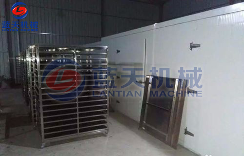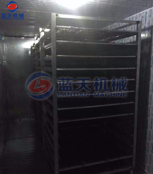 1)將木耳或云耳一層層均勻擺放至特氟龍材質(zhì)的托盤后,放入不銹鋼物料車,推入木耳烘干房,木耳烘干時的溫度應(yīng)從35℃開始,如果溫度過高,排濕跟不上,容易引起木耳變形。