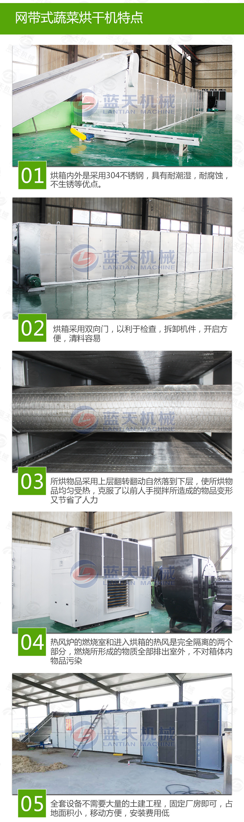 一、網帶蔬菜烘干機是一種批量、連續式生產的干燥烘干設備,主要加熱方式有電加熱、蒸汽加熱、熱風加熱。其工作方式是將要烘干的物料如蔬菜均勻的平鋪在網帶上,網帶采用12-60目的鋼絲網帶,由傳動裝置拖動在大型蔬菜烘干設備內往返移動,熱風在物料間穿流而過,水蒸氣從排濕孔中排出,從而達到干燥的目的,箱體長度由標準段組合而成,為了節約場地,可將烘干機制成多層式,常見的有二室三層、二室五層、長度6-40m,有效寬度0.6-3.0m。