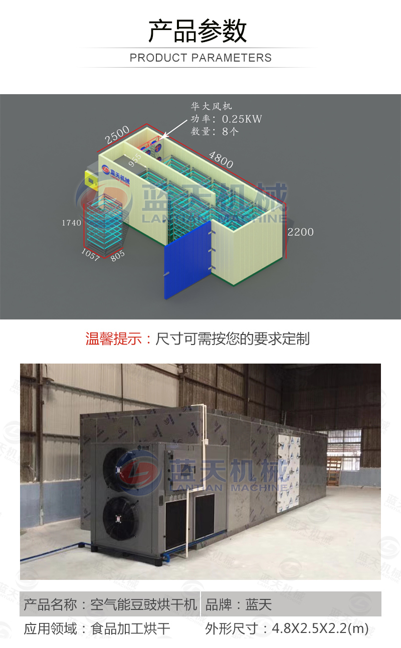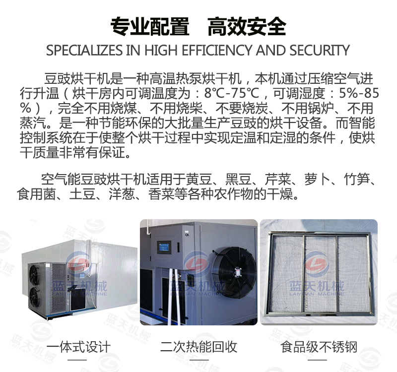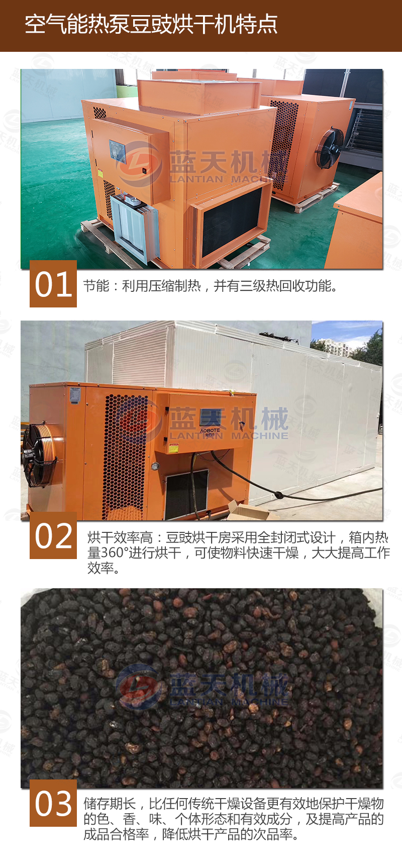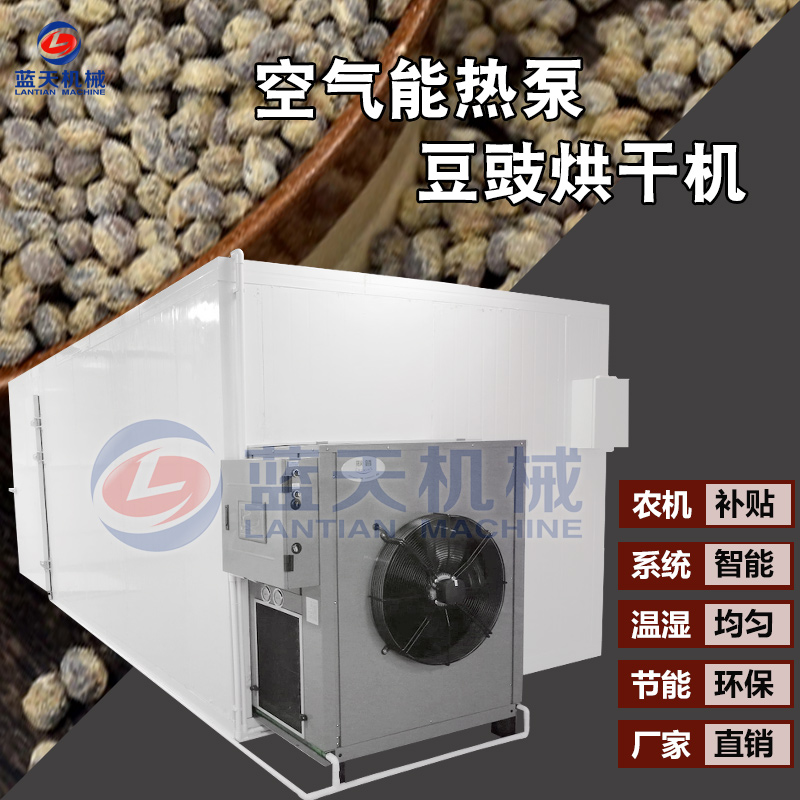 豆豉富含蛋白質(zhì)、各種氨基酸、乳酸、磷、鎂、鈣及多種維生素,色香味美,我國南北部都有加工食用。但若不注意加工藝,會(huì)致使品質(zhì)下降,甚至霉變,造成經(jīng)濟(jì)損失。傳統(tǒng)上使用太陽光曬制,但是生產(chǎn)效率低下,并且在曬制過程中極容易有污染,本文介紹使用一種基于空氣能熱泵技術(shù)的豆豉烘干設(shè)備,大大加快了豆豉的生產(chǎn)流程。