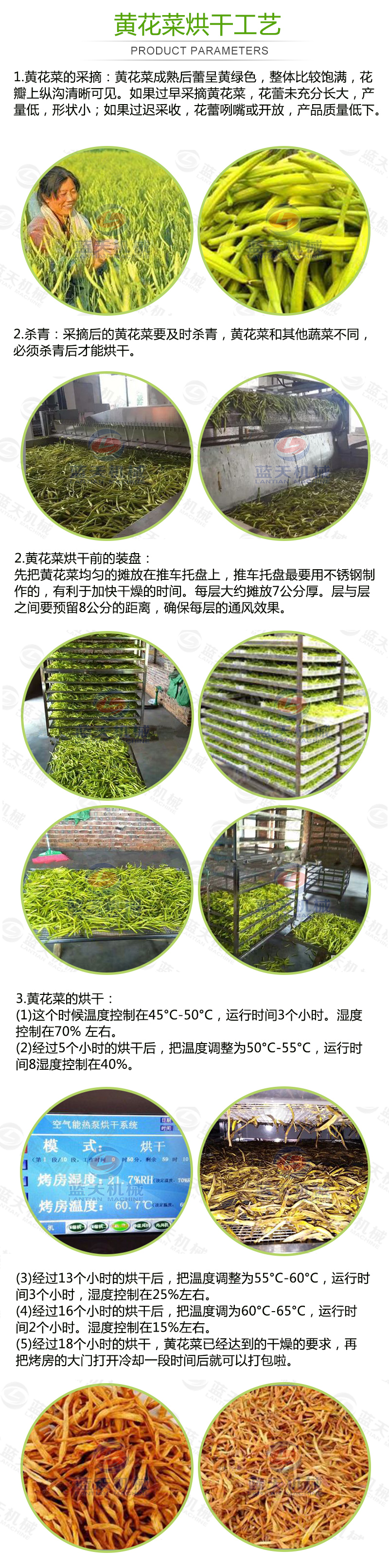 尾末的一段時間的烘干過程,要注意觀察黃花菜排水及干燥的程度,可根據干燥情況,繼續升高溫度,再烘干4小時左右,然后結束整個烘干流程。