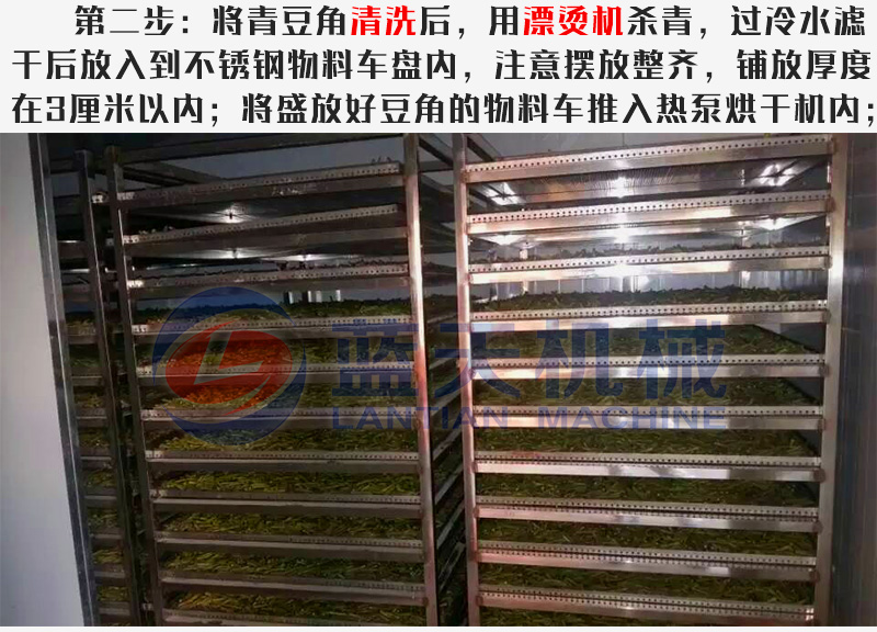 二:將青豆角清洗后,用沸水煮熟,濾干水后放入到不銹鋼物料車盤內(nèi),注意擺放整齊,鋪放厚度在3厘米以內(nèi)。