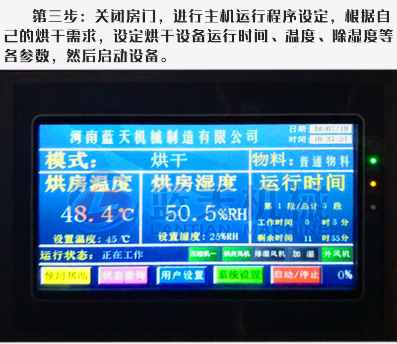 三:將盛放好豆角的物料車推入豆角烘干機設(shè)備內(nèi),關(guān)閉房門,進行主機運行程序設(shè)定,根據(jù)自己的烘干需求,設(shè)定烘干設(shè)備運行時間、溫度、除濕度等各參數(shù),然后啟動設(shè)備。